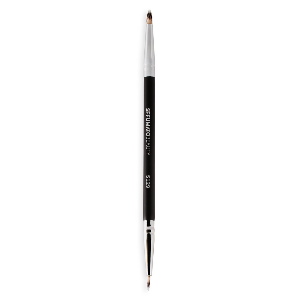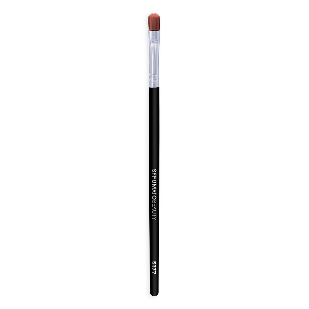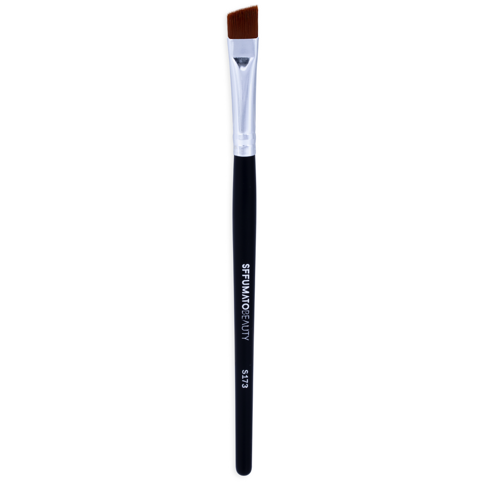 Pincel de cerdas sintéticas e chanfrada, para fazer delineado e correção de sobrancelhas.